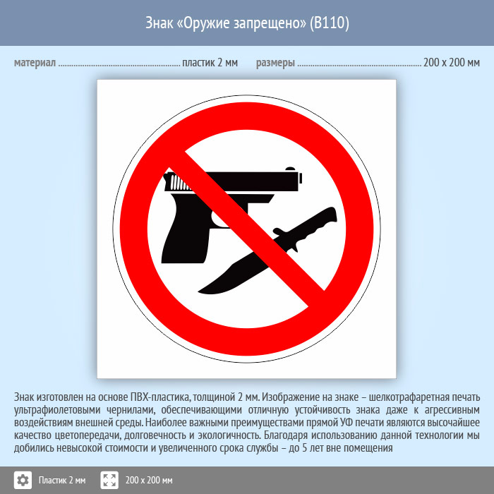 Знак «Оружие запрещено», B110 (пластик, 200х200 мм) в Омске купить