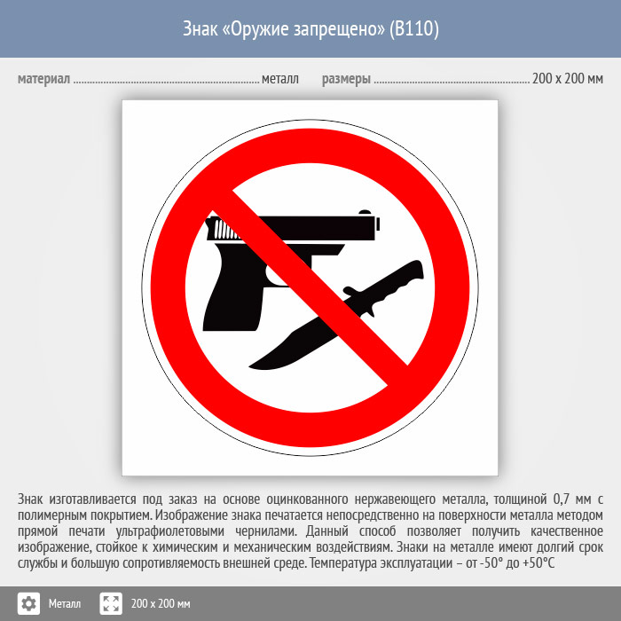Знак «Оружие запрещено», B110 (металл, 200х200 мм) в Омске купить