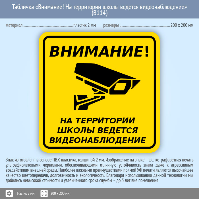 Табличка «Внимание! На территории школы ведется видеонаблюдение», B114 (пластик, 200х200 мм) в Омске купить