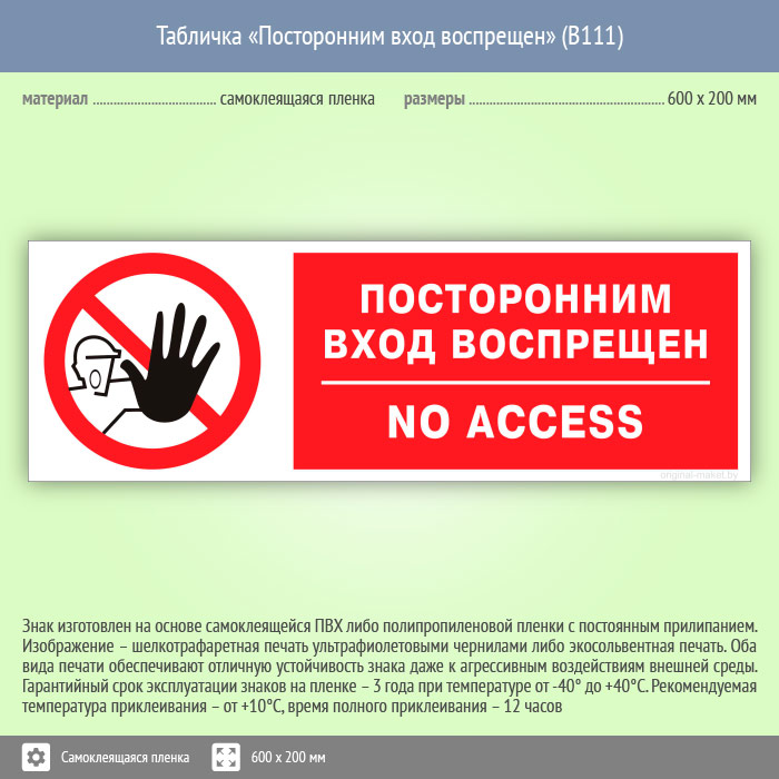 Табличка «Посторонним вход воспрещен», B111 (пленка, 600х200 мм) в Омске купить