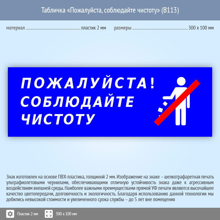 Табличка «Пожалуйста, соблюдайте чистоту», B113 (пластик, 300х100 мм) в Омске купить