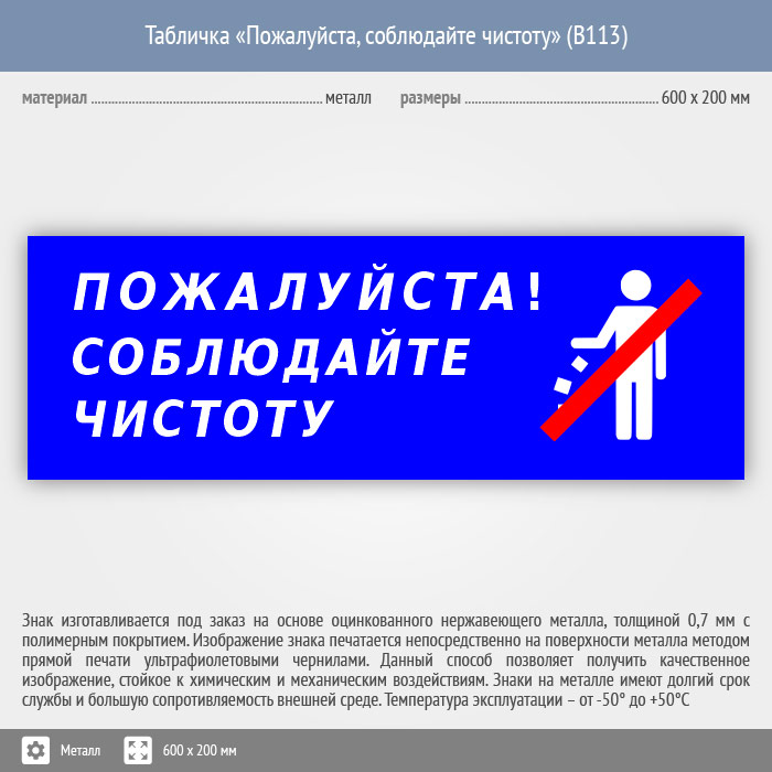Табличка «Пожалуйста, соблюдайте чистоту», B113 (металл, 600х200 мм) в Омске купить