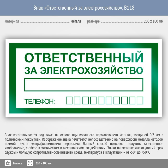 Знак «Ответственный за электрохозяйство», B118 (металл, 200х100 мм) в Омске купить