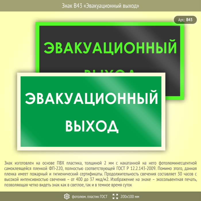 Знак B43 «Эвакуационный выход» (фотолюминесцентный пластик ГОСТ 34428-2018, 200х100 мм) в Омске купить