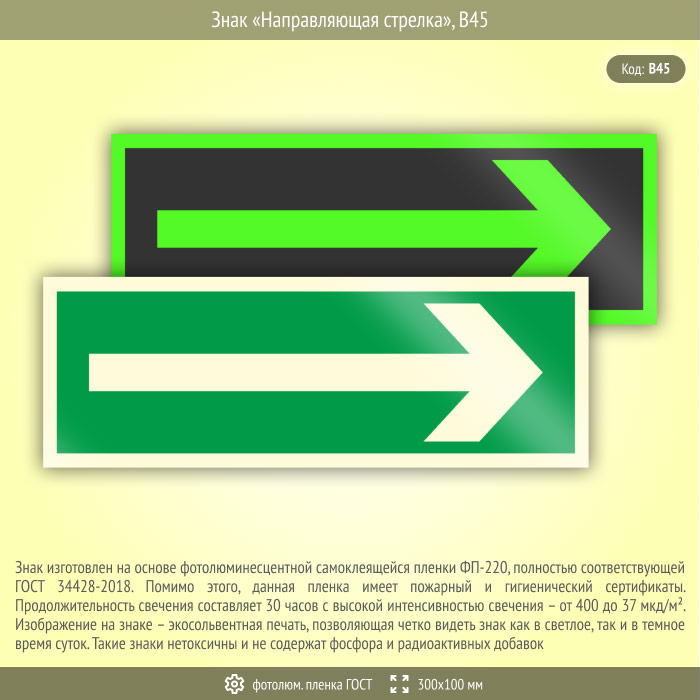 Знак «Направляющая стрелка», B45 (фотолюминесцентная пленка ГОСТ 34428-2018, 300х100 мм) в Омске купить
