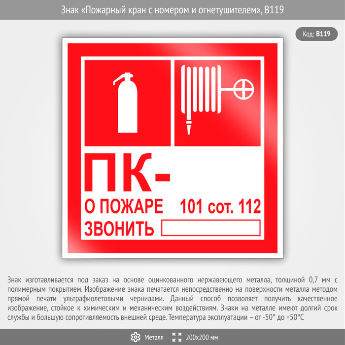 Знак «Пожарный кран с номером и огнетушителем», B119 (металл, 200х200 мм) в Омске купить