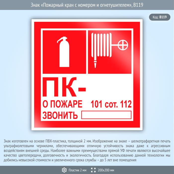 Знак «Пожарный кран с номером и огнетушителем», B119 (пластик, 200х200 мм) в Омске купить
