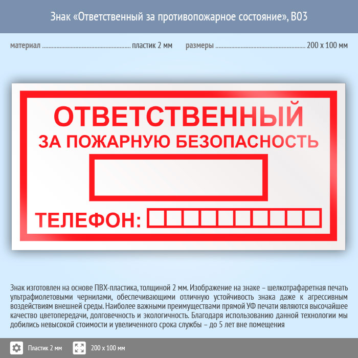 Знак «Ответственный за пожарную безопасность», B03 (пластик, 200х100 мм) в Омске купить