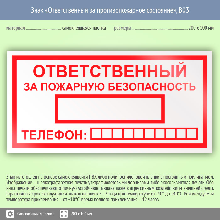 Знак «Ответственный за пожарную безопасность», B03 (пленка, 200х100 мм) в Омске купить
