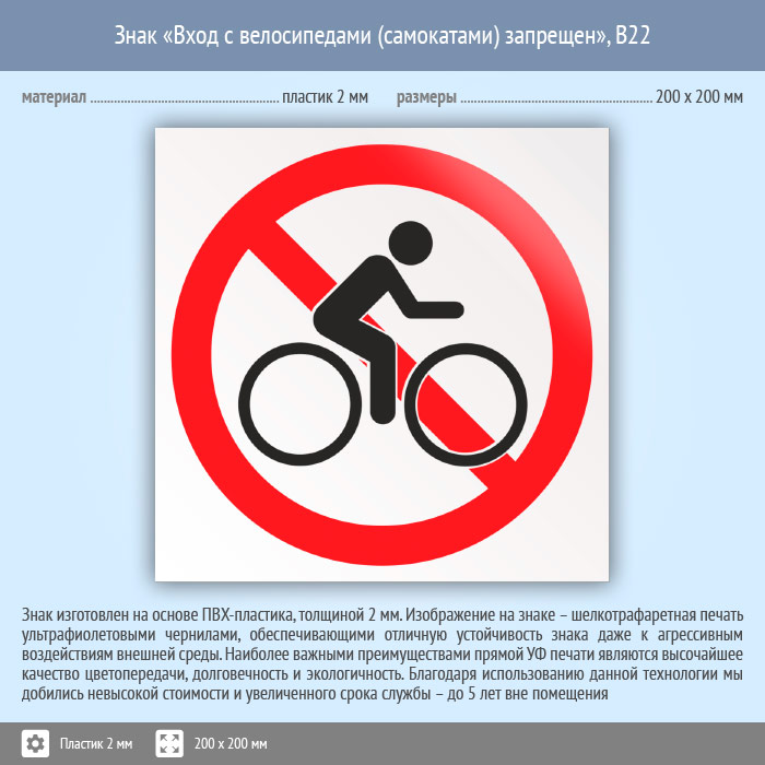 Знак «Вход с велосипедами (самокатами) запрещен», B22 (пластик, 200х200 мм) в Омске купить