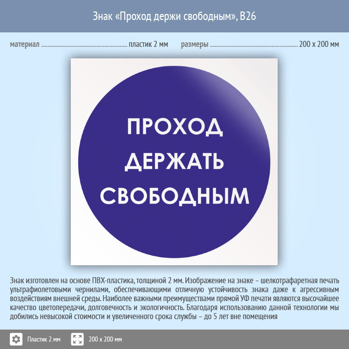 Знак «Проход держи свободным», B26 (пластик, 200х200 мм) в Омске купить