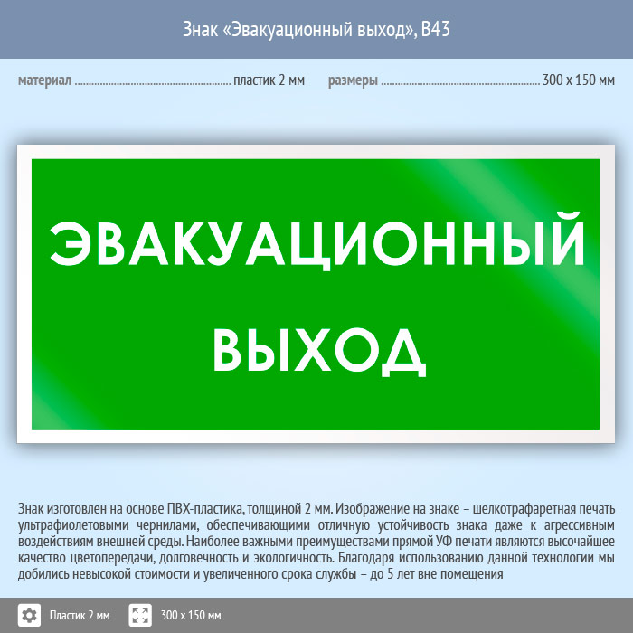 Знак «Эвакуационный выход», B43 (пластик, 300х150 мм) в Омске купить