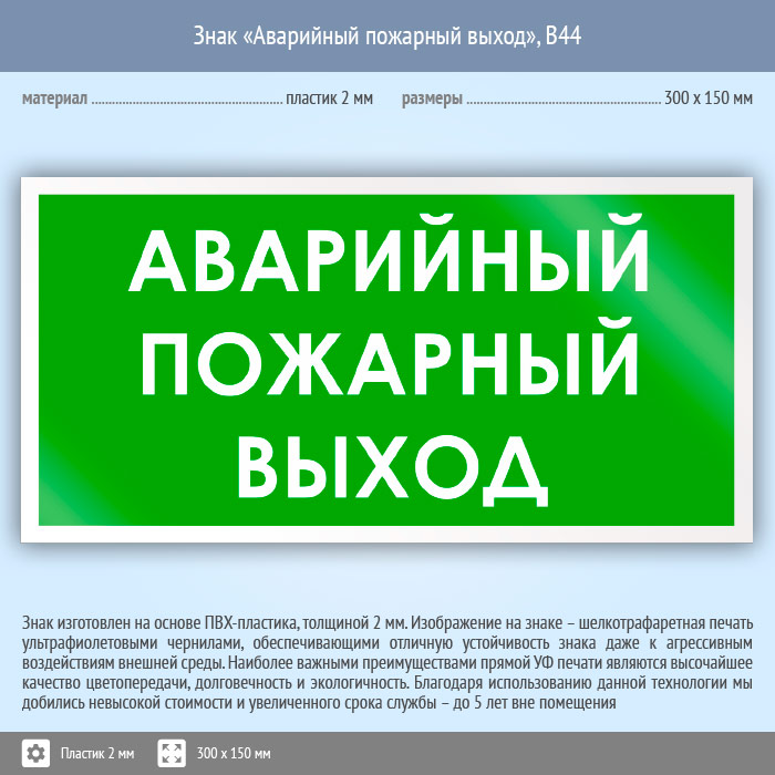 Знак «Аварийный пожарный выход», B44 (пластик, 300х150 мм) в Омске купить
