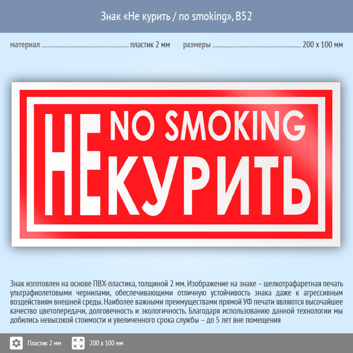 Знак «Не курить / no smoking», B52 (пластик, 200х100 мм) в Омске купить