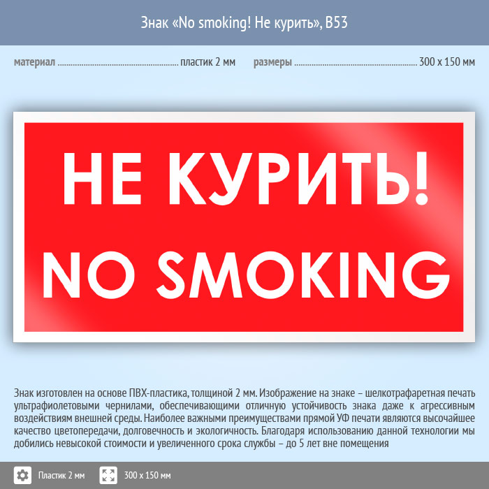 Знак «No smoking! Не курить», B53 (пластик, 300х150 мм) в Омске купить
