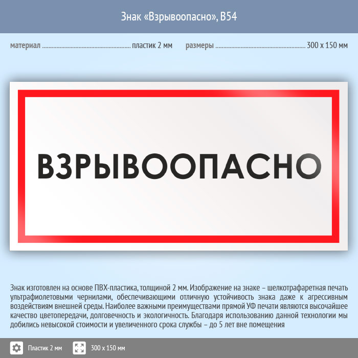 Знак «Взрывоопасно», B54 (пластик, 300х150 мм) в Омске купить
