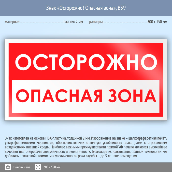 Знак «Осторожно! Опасная зона», B59 (пластик, 300х150 мм) в Омске купить