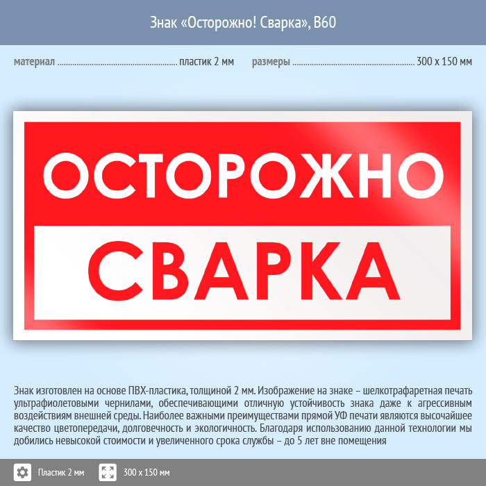 Знак «Осторожно! Сварка», B60 (пластик, 300х150 мм) в Омске купить
