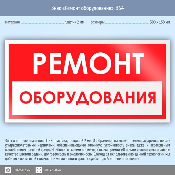 Знак «Ремонт оборудования», B64 (пластик, 300х150 мм) в Омске купить