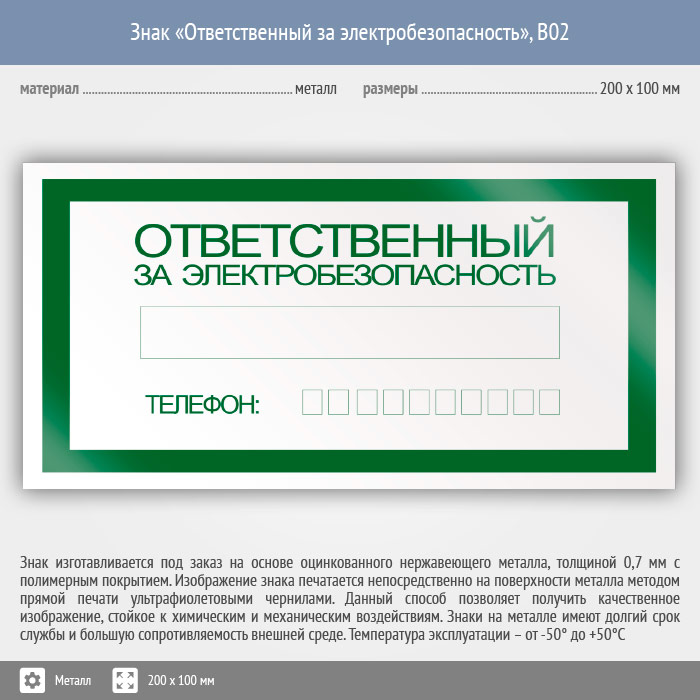 Знак «Ответственный за электробезопасность», B02 (металл, 200х100 мм) в Омске купить