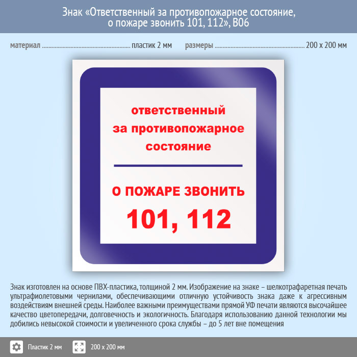 Знак «Ответственный за противопожарное состояние, о пожаре звонить 101, 112», B06 (пластик, 200х200 мм) в Омске купить
