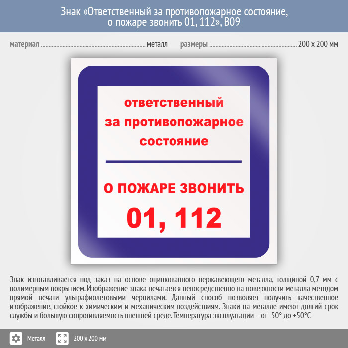 Знак «Ответственный за противопожарное состояние, о пожаре звонить 01, 112», B09 (металл, 200х200 мм) в Омске купить