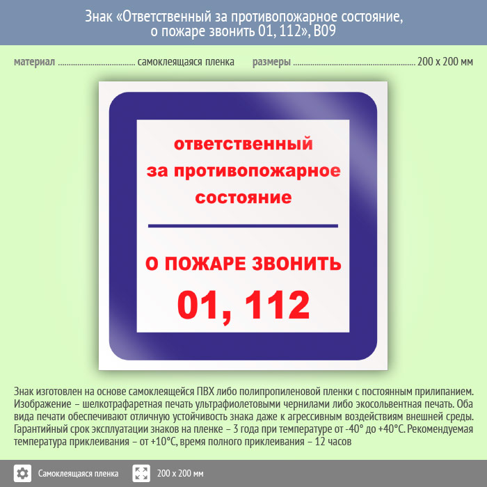 Знак «Ответственный за противопожарное состояние, о пожаре звонить 01, 112», B09 (пленка, 200х200 мм) в Омске купить