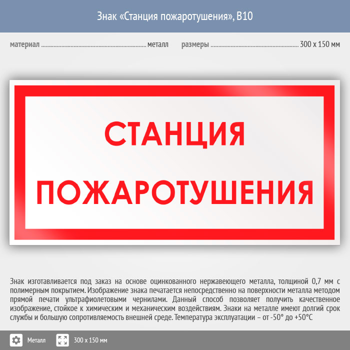 Знак «Станция пожаротушения», B10 (металл, 300х150 мм) в Омске купить