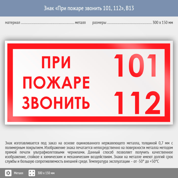 Знак «При пожаре звонить 101, 112», B13 (металл, 300х150 мм) в Омске купить