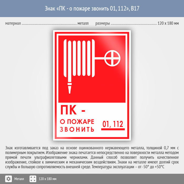 Знак «ПК - о пожаре звонить 01, 112», B17 (металл, 120х180 мм) в Омске купить