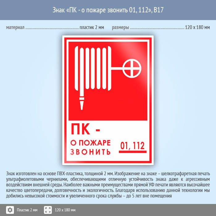 Знак «ПК - о пожаре звонить 01, 112», B17 (пластик, 120х180 мм) в Омске купить
