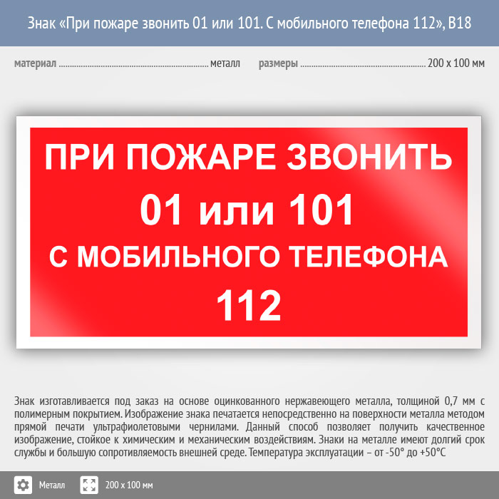 Знак «При пожаре звонить 01 или 101. С мобильного телефона 112», B18 (металл, 200х100 мм) в Омске купить