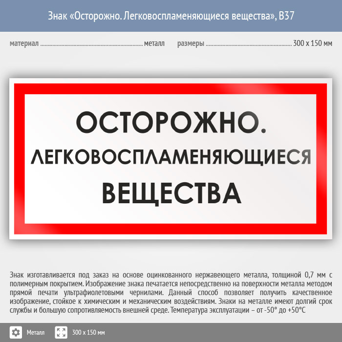 Знак «Осторожно. Легковоспламеняющиеся вещества», B37 (металл, 300х150 мм) в Омске купить