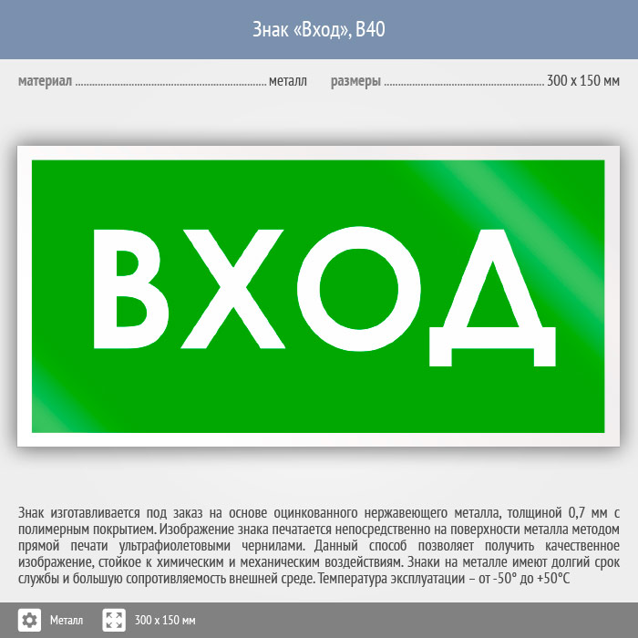 Знак «Вход», B40 (металл, 300х150 мм) в Омске купить