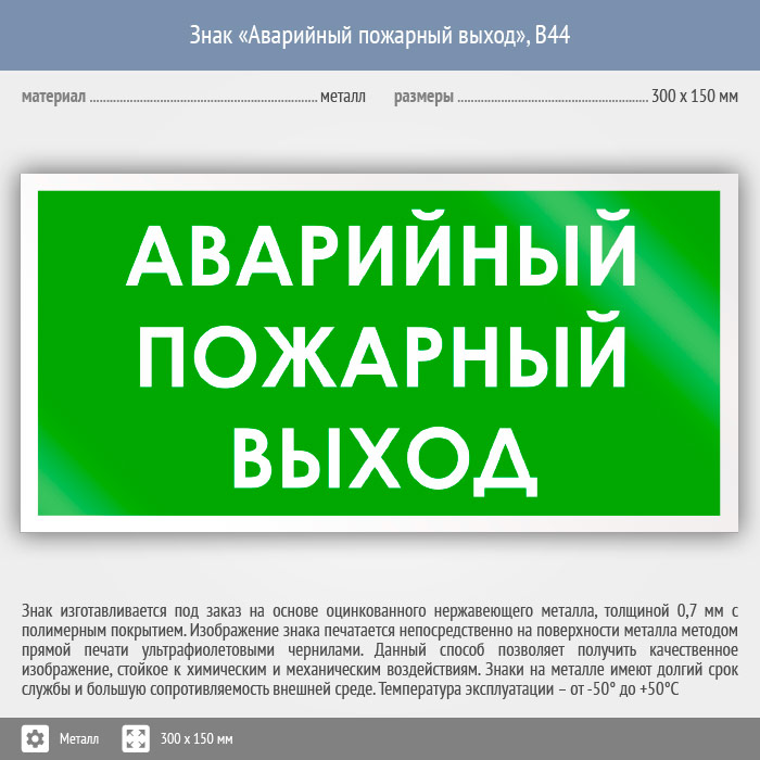 Знак «Аварийный пожарный выход», B44 (металл, 300х150 мм) в Омске купить
