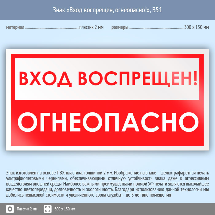 Знак «Вход воспрещен, огнеопасно!», B51 (пластик, 300х150 мм) в Омске купить