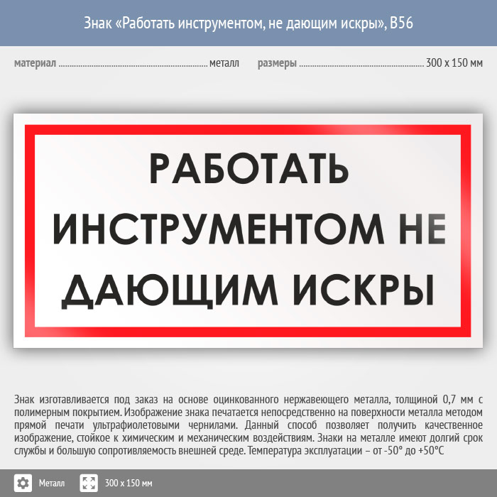 Знак «Работать инструментом, не дающим искры», B56 (металл, 300х150 мм) в Омске купить