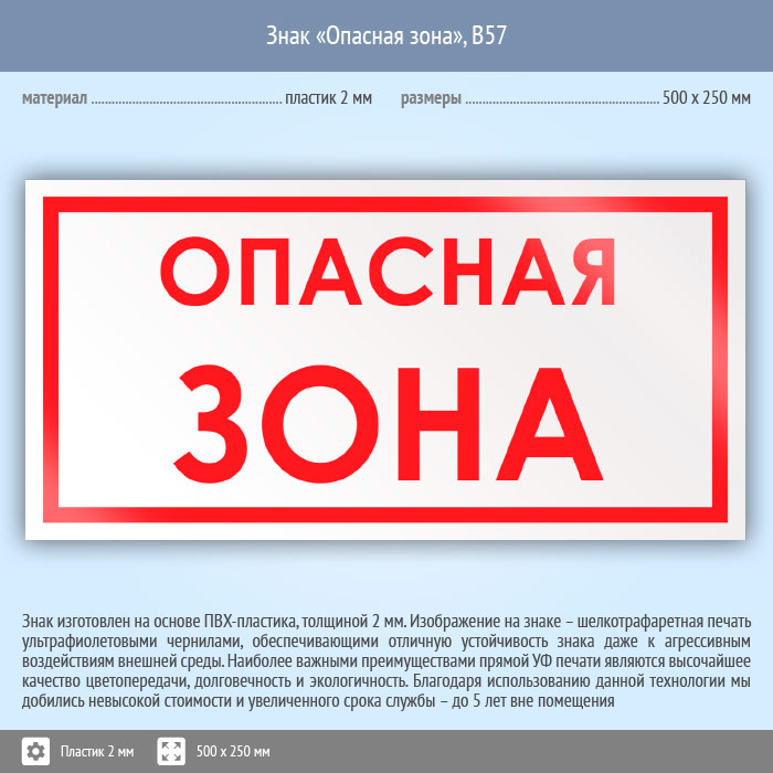 Знак «Опасная зона», B57 (пластик, 500х250 мм) в Омске купить