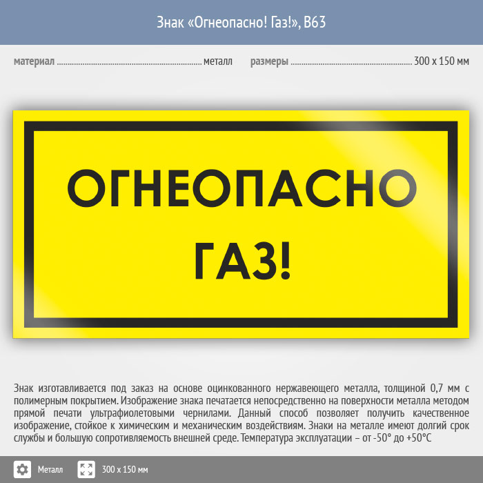 Знак «Огнеопасно! Газ!», B63 (металл, 300х150 мм) в Омске купить