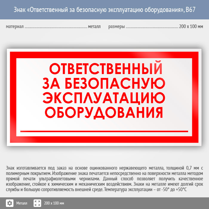 Знак «Ответственный за безопасную эксплуатацию оборудования», B67 (металл, 200х100 мм) в Омске купить