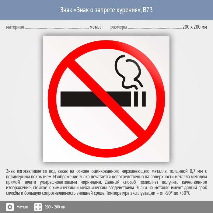 Знак «Знак о запрете курения», B73 (металл, 200х200 мм) в Омске купить