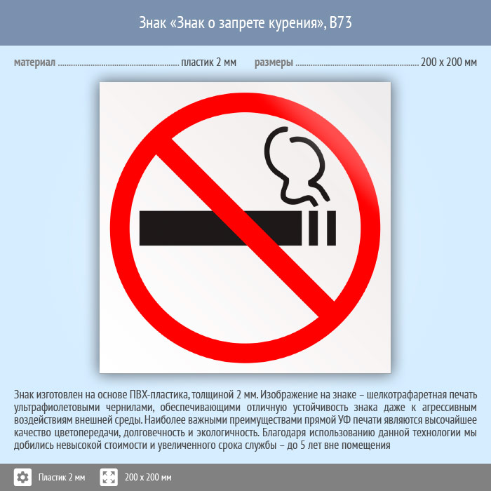 Знак «Знак о запрете курения», B73 (пластик, 200х200 мм) в Омске купить