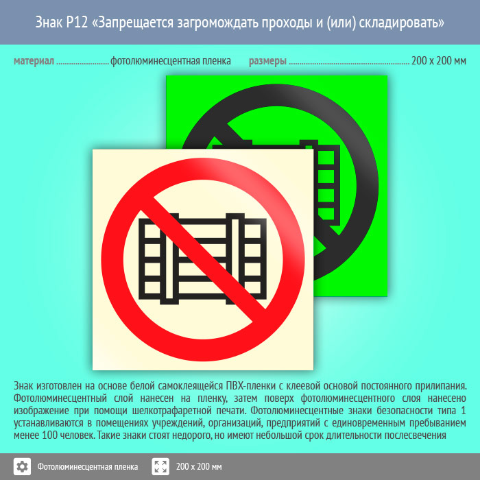 Знак P12 «Запрещается загромождать проходы и (или) складировать» (фотолюминесцентная пленка, 200х200 мм) в Омске купить