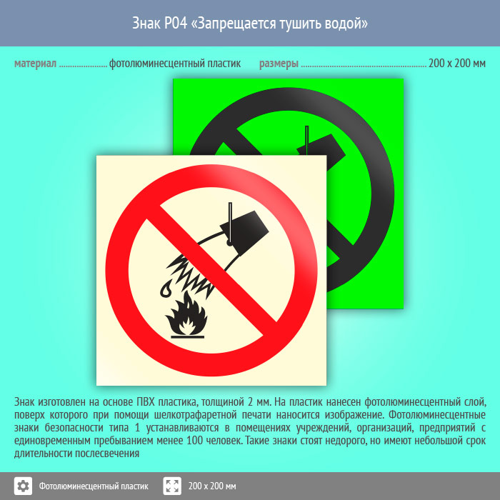 Знак P04 «Запрещается тушить водой» (фотолюминесцентный пластик, 200х200 мм) в Омске купить