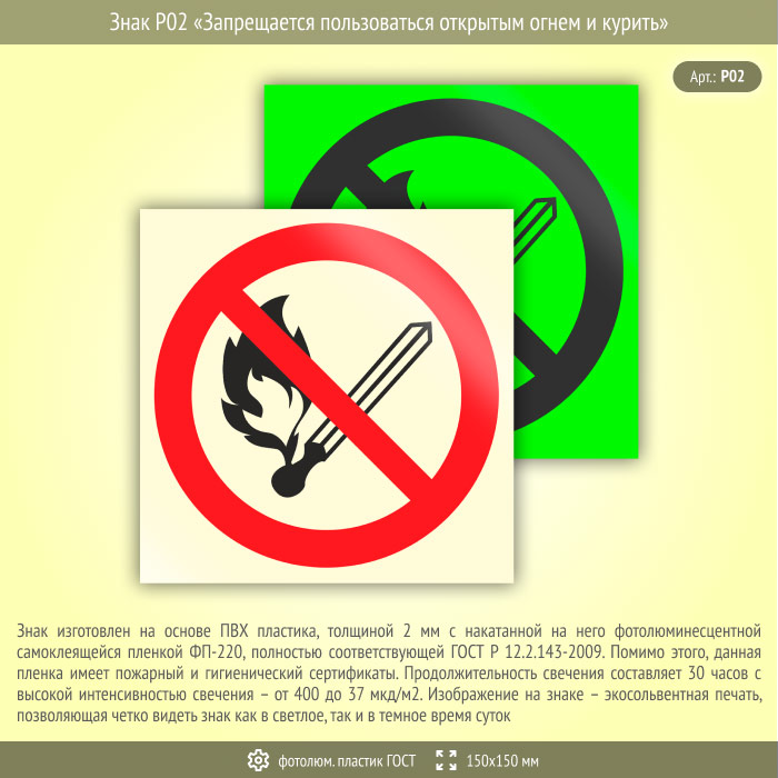Знак P02 «Запрещается пользоваться открытым огнем и курить» (фотолюминесцентный пластик ГОСТ 34428-2018, 150х150 мм) в Омске купить