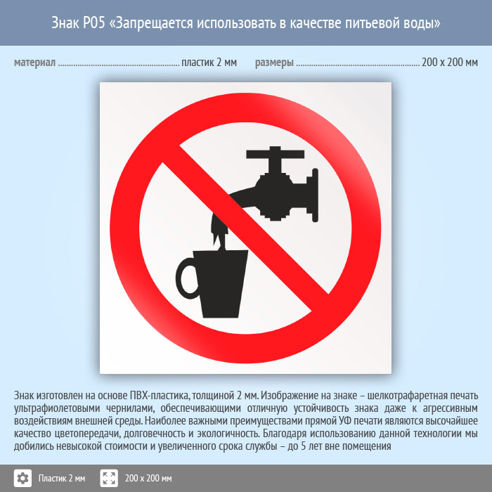 Знак P05 «Запрещается использовать в качестве питьевой воды» (пластик, 200х200 мм) в Омске купить