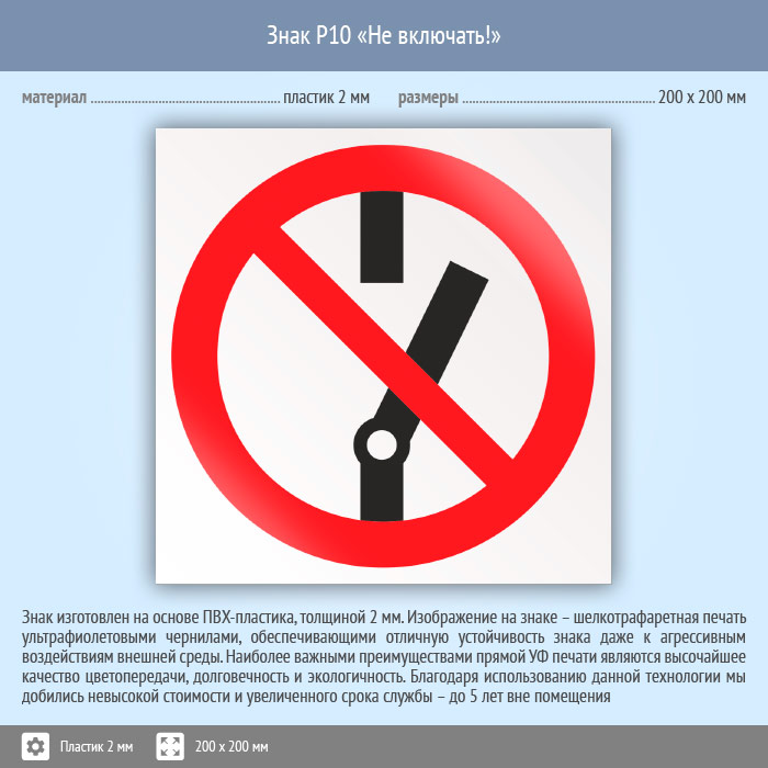 Знак P10 «Не включать!» (пластик, 200х200 мм) в Омске купить