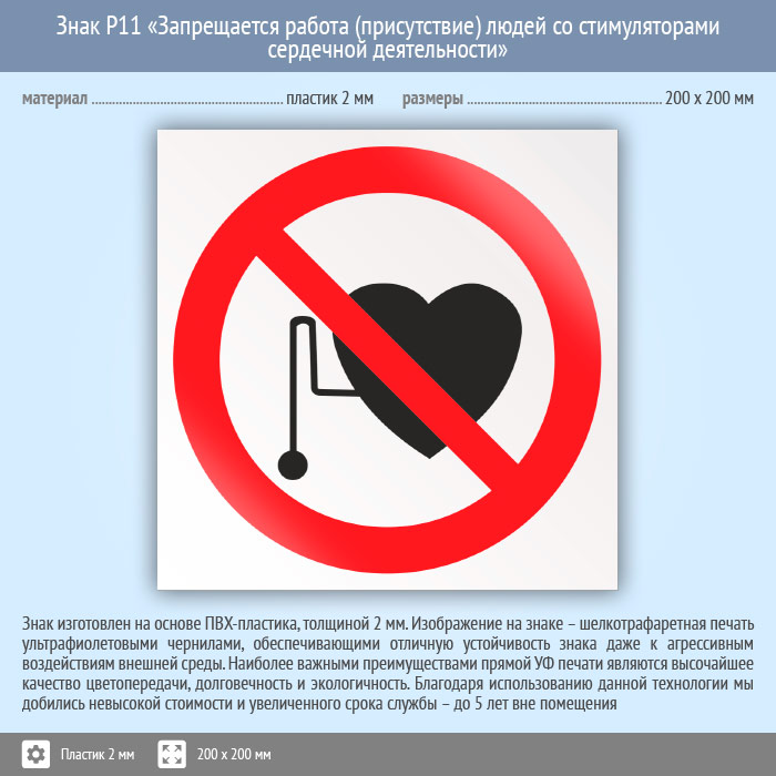Знак P11 «Запрещается работа (присутствие) людей со стимуляторами сердечной деятельности» (пластик, 200х200 мм) в Омске купить
