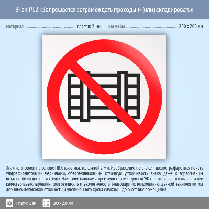 Знак P12 «Запрещается загромождать проходы и (или) складировать» (пластик, 200х200 мм) в Омске купить