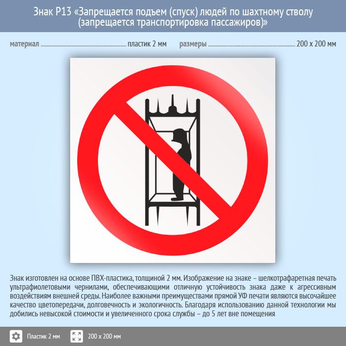 Знак P13 «Запрещается подъем (спуск) людей по шахтному стволу (Запрещается транспортировка пассажиров)» (пластик, 200х200 мм) в Омске купить